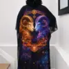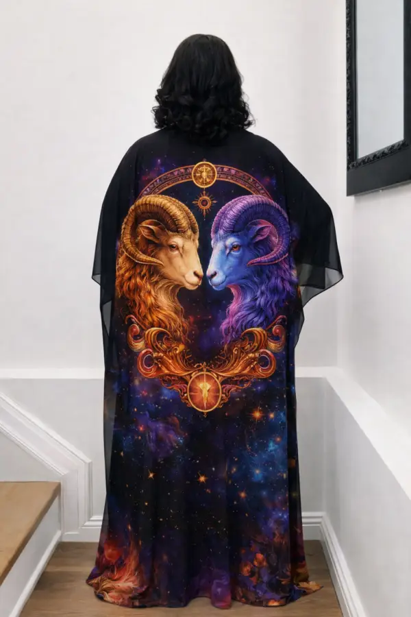 Turn the Kaftan around and the story deepens. The back reveals two celestial rams facing one another — a symbolic reflection of Aries energy: fearless yet thoughtful, powerful yet intuitive. Framed by glowing cosmic patterns and zodiac symbolism, the artwork evokes the infinite universe from which Aries draws its fire.