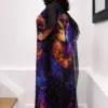Flowing effortlessly from shoulder to floor, the Kaftan’s silhouette is both dramatic and graceful. Sheer chiffon sleeves create movement and lightness, allowing the vibrant celestial artwork to float around the body like a living constellation.