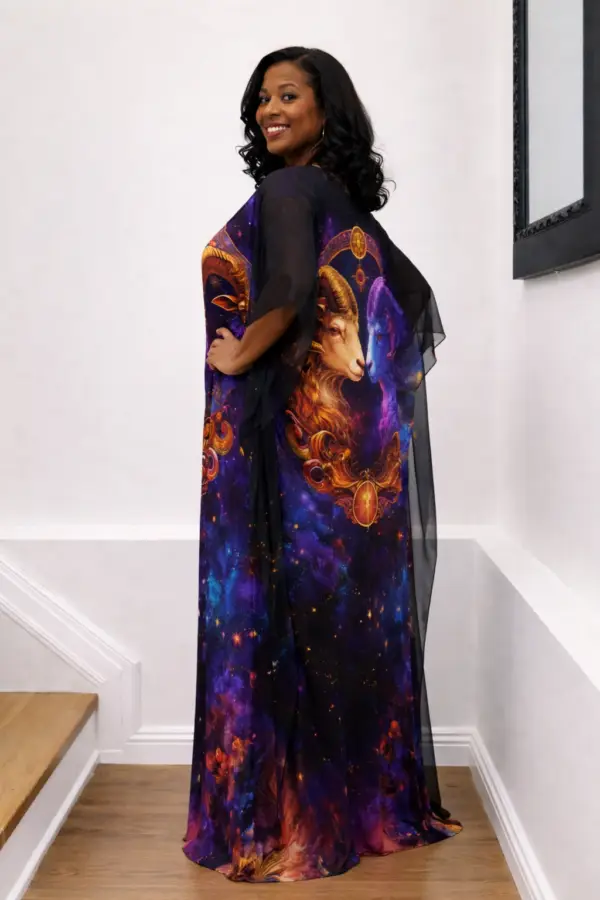 The front of the Kaftan features a magnificent ram crowned within a celestial zodiac circle, surrounded by a deep galaxy of midnight blues, fiery purples, and starlit gold. At the center of the design sits the word ARIES, honoring the bold spirit of those who lead rather than follow.