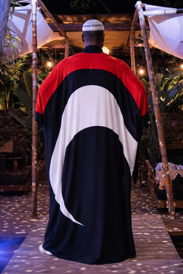 The Crescent Eclipse Kaftan is a striking statement piece designed for those who understand the power of presence. A dramatic oversized crescent sweeps across the front of the garment, creating a powerful visual that evokes the quiet mystery and beauty of a lunar eclipse.