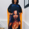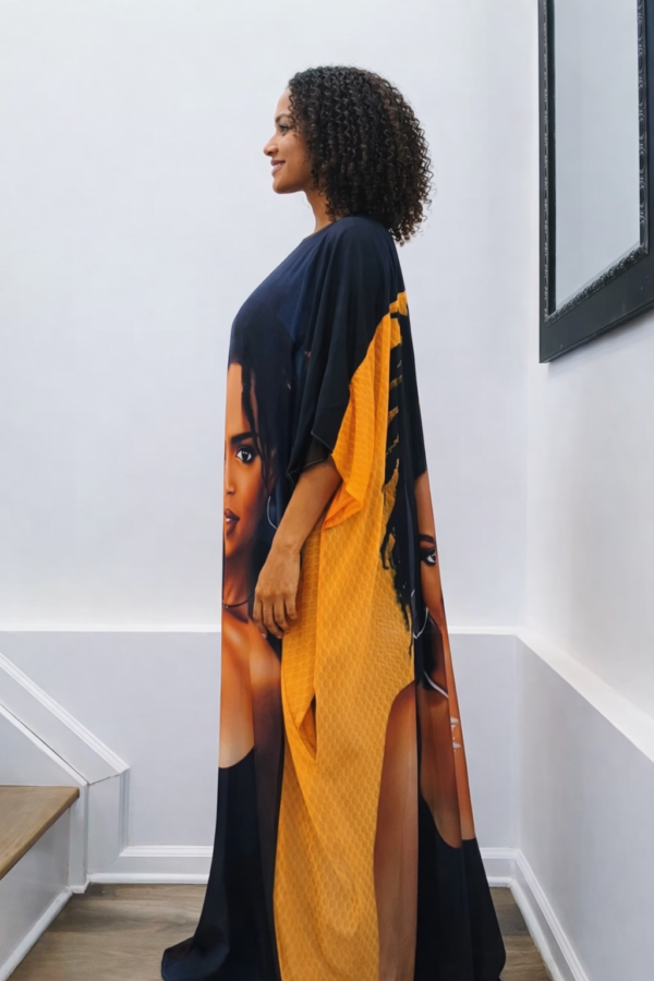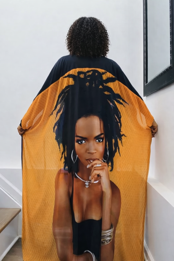 A radiant, soul-forward statement piece honoring the brilliance, beauty, and legacy of Lauryn Hill. This kaftan features distinct front and back imagery, allowing the garment to tell a layered visual story from every angle.