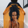 The back reveals an equally striking portrait set against a luminous golden background. With her iconic locs and contemplative gaze, this image embodies Lauryn’s intellect, vulnerability, and spiritual grounding. The expansive artwork flows across the back, creating dramatic movement and visual impact as you walk.