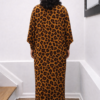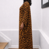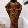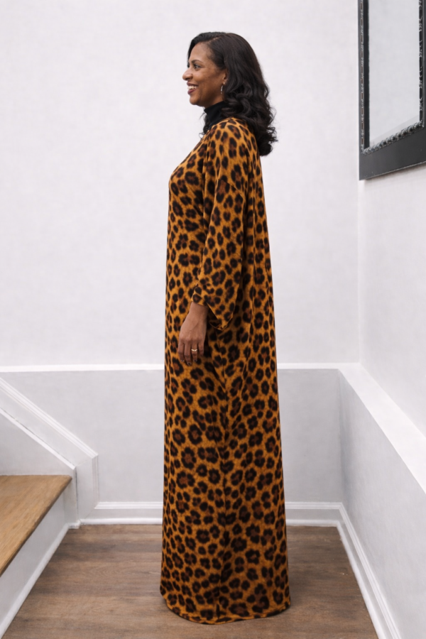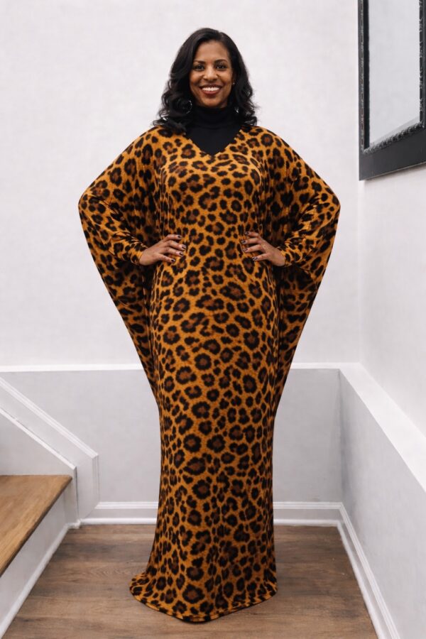 Crafted in a striking leopard print that feels both timeless and boldly modern, the silhouette flows with intention—elongated, fluid, and statuesque. The printed stretch jersey fabric drapes beautifully over the body, skimming rather than clinging, creating a look that is at once relaxed and undeniably luxurious. The deep V-neckline adds subtle drama, while the wide, winged sleeves evoke movement, freedom, and quiet opulence.