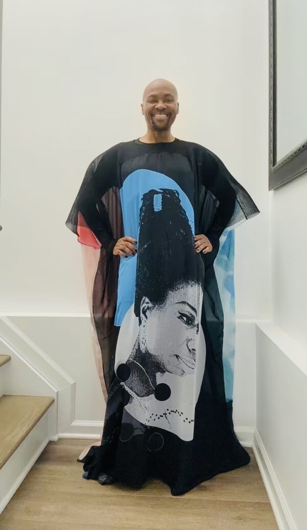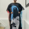 Nina Simone Tribute Kaftan:  The front features a striking monochromatic portrait of Nina Simone set against cool blue and black tones. The composition feels intimate and contemplative, capturing her quiet strength, intelligence, and unmistakable poise. The centered artwork elongates the silhouette, creating a powerful yet elegant focal point.